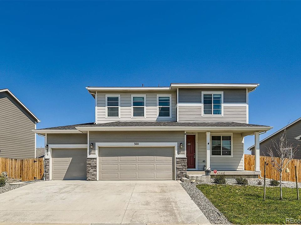 Welcome to 300 Wheatberry Drive, a stunning two-story home nestled in the desirable Brighton East Farms community. Built in 2021, this beautifully maintained residence offers the perfect blend of modern comfort, spacious design, and timeless curb appeal—all set on a generous 8,364 sq ft lot. Step inside to discover a bright and open layout that flows effortlessly from room to room. The main level features a welcoming family room, dining area, and a well-appointed kitchen that serves as the heart of the home—ideal for entertaining or quiet evenings in. A main floor formal living room/flex space with easy access to a half bath offers flexible living options, whether for an additional sitting room, music space or library. Upstairs, you'll find the spacious primary suite complete with a private en-suite bath and ample walk-in closet space. Two additional bedrooms, 3/4 bathroom, private spacious loft and a convenient upstairs laundry room complete the second floor—providing both function and space for every lifestyle. Double sliding patio doors welcome you to the quaint backyard featuring an expansive patio and private covered veranda. This outdoor living space invites endless possibilities for year-round enjoyment, while the attached three-car garage offers plenty of room for vehicles, sporting gear and extra storage. Located just minutes from the community park, local schools, shopping, and easy access to I-76 & DIA, this home is perfectly positioned for both convenience and community. Whether you're looking to grow, settle in, or simplify, this home offers the space and setting to make your next chapter feel like home.