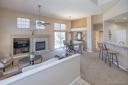 Rare Ranch style Townhome in the beautifully maintained complex of Homestead at 7 Stones. End unit with easy access and no stairs to this 2 bedroom, 2 full baths and 2 gar attached garage. Steps away from the Fabulous Carpenter Park. This park is one of the jewels of the Northglenn park and Rec system. It has walking trails, a large Rec Center, a Lake and lots of other outdoor activities. High 12 foot ceilings with light and bright upper windows. Open Great room living area with a gas fireplace and formal dinning area. The Kitchen is open to the entire Great room with bar height seating. Ceramic tile counters and all kitchen appliances included. The Primary bedroom also has 12 ft. ceilings, large closet, plantation shutters and a 5 piece bath. Cute 2nd bedroom and a full hall bath. Tile at the entry and kitchen. Carpet through out the other areas. Sliding patio doors open to a quiet patio area. Full size laundry with Washer and Dryer included. Furnace, water heater and A/C are all in good condition. Great attached 2 car garage with some new shelving units and high ceilings. Enjoy the new high speed 1 gig fiber optic internet speed available to the complex. Beautifully maintained complex with a strong HOA.