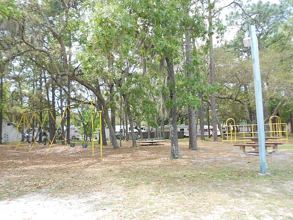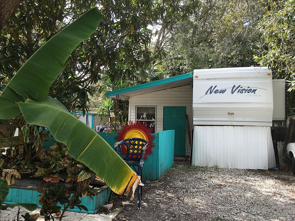 You own the land, you own the land! Fee simple larger than average lot with 5th wheel attached to land with large enclosed storage area. Many custom features. Inside you will find lots of cabinet space, kitchen, living room, bathroom with separate room commode. All furnishing built in-to the 5th wheel come with the purchase. On the exterior you will find utility shed, pond, carport and trees. Price includes fee simple land. The monthly Condo fees are only $131.00 which includes water, sewer, trash pickup six days a week, 24/7 staffed gatehouse, 110,000 gallon Pool, On-Site Condo Office and Management, Community Watch and maintenance of community grounds. Just pay your condo dues and metered electric bill for a prime location in sunny Florida! Our location is very convenient with lots of dining, hospital and shopping close by. You own the land, No lot rent.