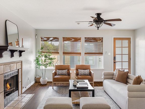 Cozy fireplaceWarm wood floorsWall of windowsTwo living spacesNatural lightTreetop viewsOversized corner lot