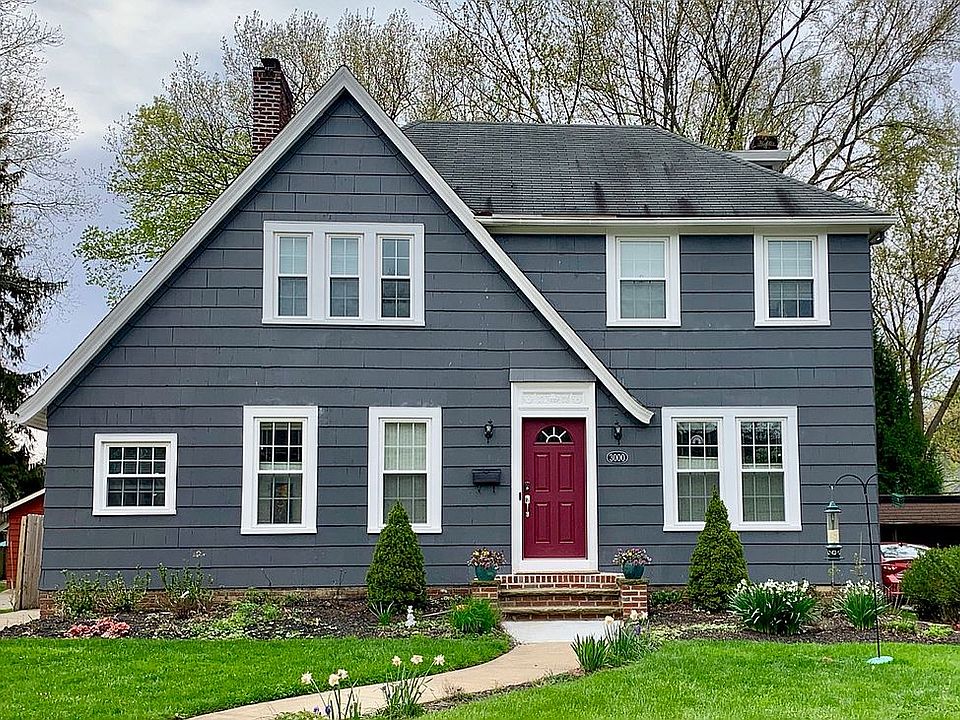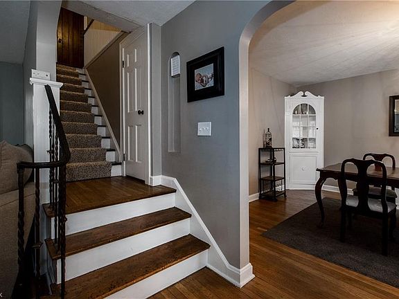 Large open living room with bay window and wood burning fireplace, opens to light-filled sunroom, with walls of built-in bookshelves, brick accent wall and access to rear yard. Formal dining room has 2 built-in china cabinets. First floor powder room (1/2 bath.) The updated kitchen features quartz counters, tile backsplash, porcelain farmhouse sink, stainless appliances, island/breakfast bar and separate eating area. 2nd floor bathroom renovated with white subway tile in tub/shower. The finished third features a bedroom, large walk-in closet and full bath with claw foot soaking tub w/ hand shower. Additional features include: hardwood floors, newer boiler, wood fence, rare two-car attached garage.
