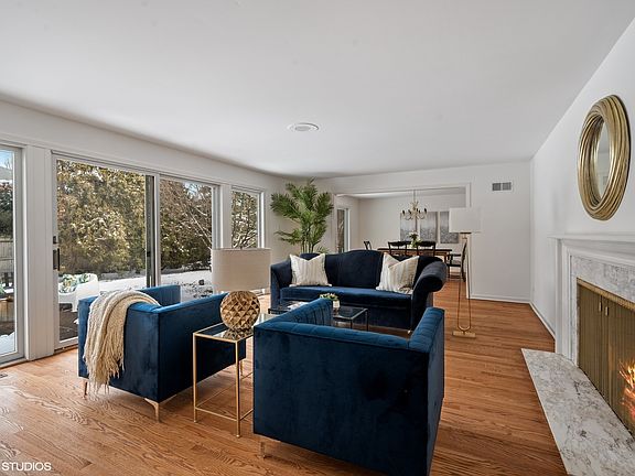 A timeless classic set in idyllic Indian Hill Estates, this elegant ranch home checks every box on picturesque Indianwood Rd. You are greeted by a front porch where you can drink your coffee on a leisurely Saturday morning! The gracious foyer opens to an oversized family room with fireplace, and features a wall of floor to ceiling windows to let the light stream in! A formal dining room easily accommodates grand dinner parties, and also offers direct access to the private backyard through sliding glass doors. A lovely eat-in kitchen serves as the heart of the home, providing ample storage space for meal prep, as well as a built-in banquette, with an oversized picture window, for everyday dining. Enjoy a brand new GE Profile stainless steel dishwasher and double oven too! Do your best thinking in the oversized office at the front of the home and your "work from home" experience will never be the same! With a hidden wet bar, built-in bookcases, beautiful fireplace, another oversized picture window, the space can double as a recreation area, library, den, additional family room or jump on the latest library dining room design trend! The bedroom wing of the home features a spacious primary bedroom with direct patio access, full bath with neutral colors, and ample closets, including a cedar closet. Three secondary bedrooms and a hall bath with double sinks are all generously sized and bright with natural sunlight. This home also features a finished basement with new flooring and new windows, a wet bar and mini-fridge, and a cedar-lined closet. Gleaming hardwood floors throughout (newly refinished), "on trend" lighting, and freshly painted family and dining room plus all 4 bedrooms, are a few of the many upgrades these sellers have made. Enjoy an attached 2-car garage, private backyard and tons of natural light! D37/Avoca and New Trier schools! Welcome home! Please note the fireplaces and chimneys, sprinkler system and mini-fridge are conveyed "as-is" since they have not been used in many years. Showings begin Friday!