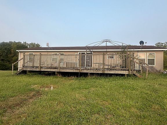 2005 Modular home with almost 1600 sf, on 6.41 acres with privacy and great views. This property offers approx 2 acres of woods, 2 acres of yard, and 2.5 acres for pasture. With a small pond in the wooded area. Home is total electric, has well, septic, large deck, fire pit area, new 10x10 metal storage unit (2023), and 4x6 metal shed (2019), and plenty of room to put garage or pole barn. Inside features master bedroom and three additional bedrooms, large open living room and dining area. Replaced both outside water spigots and the line to the out side spigot by well, the float and pump in septic, the sump pump under house and tie downs (2023) also new flooring in kitchen and both bathrooms. Some updated window treatments. Very quiet and peaceful. Deer around all the time. Underground electric dog fence and doggie door also installed (2019) Includes washer, dryer, stove, and dishwasher.