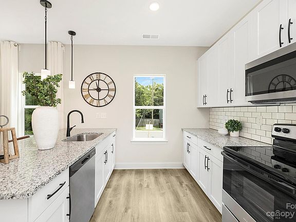 This is your opportunity to get into a modern new construction home located in booming Reid Park for under $400k. Situated on a corner lot, this beautiful 3 bedroom single family home is just minutes away from Uptown, South End and Charlotte Douglas International Airport. Open floorplan featuring 9 foot ceilings on the main and luxurious finishes such as granite countertops, white shaker cabinetry with soft close drawers/doors, subway tiled backsplash, and pendant lighting. Truly move in ready home perfect for first time buyers and investors. Loaded with upgrades including luxury vinyl plank flooring throughout, Pella windows, stainless steel appliances including fridge, and black hardware/plumbing fixtures. Primary suite offers two closets and a dual vanity. Bonus room on main can be used as a home office. No HOA or rental restrictions, can be used for short term, mid term or long term rental. $5,000 incentive towards closing costs with preferred lender & attorney. Warranty included.