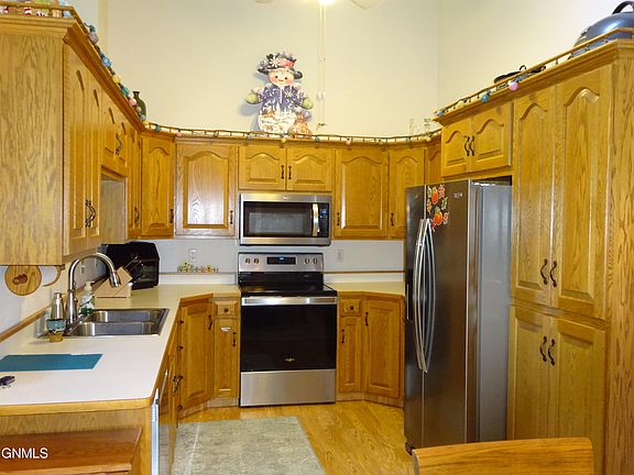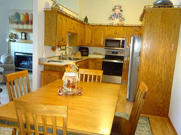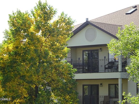 TOP FLOOR SE END/CORNER UNIT WITH WONDERFUL NE TO SE VIEWS OVERLOOKING THE PARK AND NORTH BISMARCK. This beautiful move-in-ready Condo features vaulted ceilings, gas fireplace in the Living Room, new window treatments (Hunter Douglas), all NEW appliances in the Kitchen which has an abundance of cabinets with pull-outs. 6 panel oak doors throughout. The Master Bedroom Suite has a full bath and a walk-in closet. A large guest bedroom with a double closet. There is a 2nd full bath, and a convenient hallway laundry with cabinets and the washer/dryer are included. One storage room and additional storage in the loft above the entrance. Double Garage that you access without going outside, plus a second assigned parking space with an outlet. The HOA fee includes heat, water, sewer, garbage, lawn care and snow removal. They building has an elevator. There is no smoking in the building, and no pets. Some of the recent updates include new faucets throughout, window treatments in the good-sized bedrooms, ceiling fans in the guest bedroom, kitchen, a new dining area light fixture and a new garage door opener and controls. This condo has been very well maintained and is in wonderful condition. The listing agent is related to the seller. Don't Wait to see this gem!!