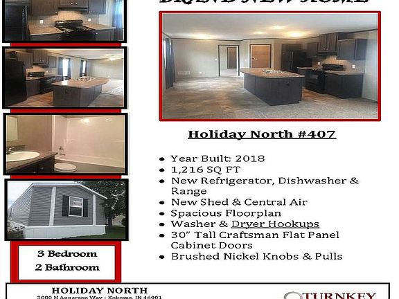 KEY FEATURES SQ Footage: 1,216 sq. ft. Bedrooms: 3 Beds Bathrooms: 2 Baths Laundry: Washer and Dryer hookups County: Howard Lot: 407 Price: $64,000 HOME FEATURES • Brand New • A/C • Shed • All new appliances • Open Concept Living Room/Dining Room • Kitchen Island with upgraded cabinets • Under/Upper Kitchen Cabinet Lighting • XL Bedrooms • 2 Full Baths This beautiful extra large 3-bedroom 2- bathroom home located in Holiday North is the perfect home! the home comes equipped with all appliances, except the washer and dryer. This home is available purchase outright. Hurry! This home will not last! Call or stop in and see us at: Holiday North 3000 N Apperson Way, Kokomo, IN 46901 ABOUT OUR COMMUNITY Holiday North, is conveniently located right off U.S. 931 and 300 N. We offer a variety of homes both for lease and for sale depending on your needs and floor plans that range from 2 bedrooms up to 4 bedrooms. At Holiday North, we can provide simple lease to own programs, reasonable move-in costs, with low monthly payment options on new and used remodeled homes. We invite you to contact us to schedule a tour of our community!