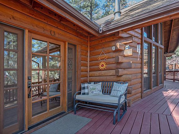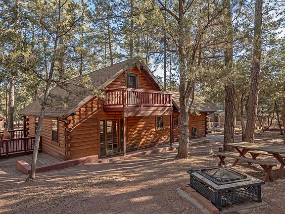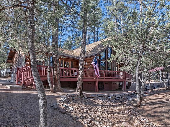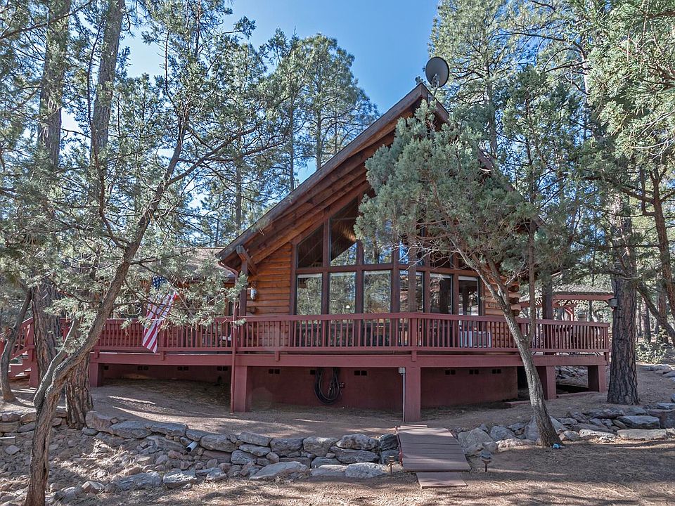 This cozy chalet-style home is tucked away on a peaceful 0.49-acre lot surrounded by a tall pine trees, making it the perfect escape. Inside, you'll find wood cathedral ceilings, floor-to-ceiling windows, and a fireplace that adds the perfect touch of warmth and charm. The home features slate floors, large kitchen pantry, and one spacious bedroom, plus a loft that's great for extra sleeping space or a relaxing retreat. Step outside to enjoy a ramada and fire pit, perfect for gatherings or quiet nights under the stars. There's also plenty of room for your vehicles and storage with 3 covered carports and a storage shed, all situated on a quiet cul-de-sac. Whether you're looking for a full-time home or weekend getaway, this chalet is a little slice of paradise in the pines!