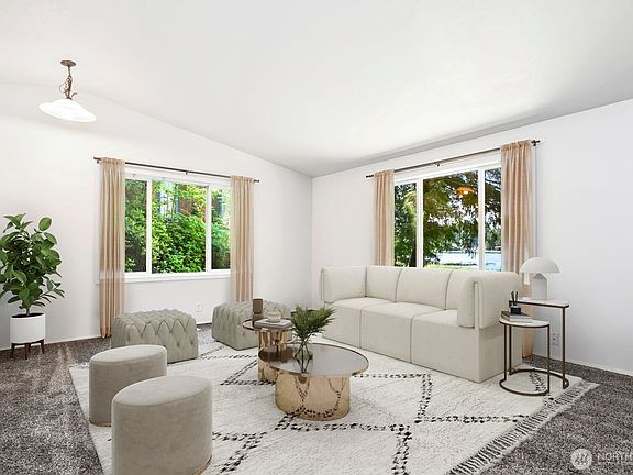 Charming 2 bed, 2 bath waterfront manufactured home on scenic Mission Lake! Nestled on a spacious .70-acre lot, this home features NEW interior paint, updated bathrooms, and NEW carpet throughout. Enjoy an open living room with vaulted ceilings that seamlessly flows into the kitchen—perfect for relaxing or entertaining. The primary suite offers vaulted ceilings and an en-suite bath. Take in breathtaking water views right from your doorstep. A peaceful lakeside retreat with room to make it your own!
