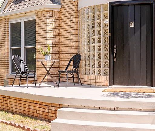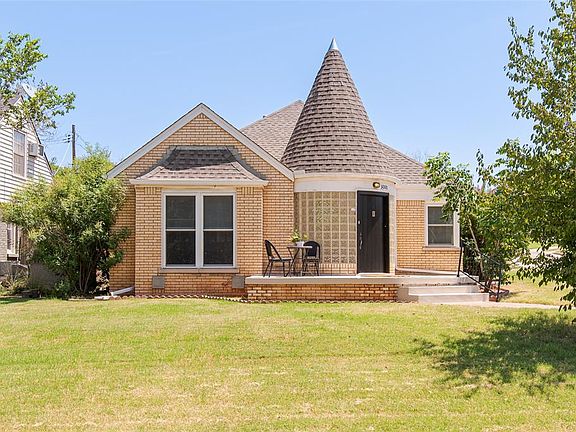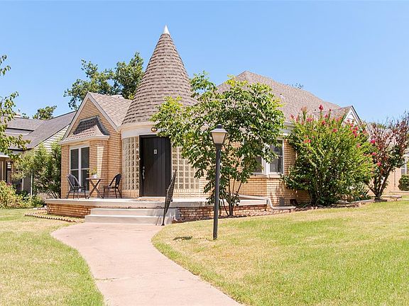 Welcome to this rare opportunity to own this captivating home nestled on a large corner lot in the enchanting Cleveland Neighborhood. With 3 large bedrooms, 2 full baths, and an attached 2 car garage you can enjoy spaciousness and modern conveniences from a home built in 1940. This property seamlessly blends historic charm with modern updates, offering a truly unique and delightful living experience. As you approach the front of the home, you are immediately greeted by an extraordinary turret front entry with a stunning curved wood front door. The entryway is filled with natural light from the glass block walls, setting the tone for what awaits inside. Step into the heart of the home, where a breathtaking barrel ceiling, elegantly adorned with intricate pendant lighting, creates a grand and welcoming ambiance. The spacious dining area boasts matching sconces, adding a touch of sophistication to your dining experiences. After a long day, cozy up to the front living area fireplace, flanked with intricate wood details or indulge in relaxation next to the den fireplace, featuring charming brick details, perfect for unwinding with a good book. The kitchen has been thoughtfully updated with luxurious marble countertops that exude both elegance and functionality. Classic tile flooring adds a fresh touch while providing easy maintenance. All three bedrooms in this home are generously sized and feature cedar closets. As you explore further, you'll discover the cute built-in office nook leading to the hall bathroom with fun original details that showcase the home's unique character. Natural light floods this space through the mesmerizing glass block details, creating an inviting and refreshing atmosphere. The beautiful original hardwoods floors throughout the home add to the inviting warmth. There is easy access to the attached garage and a mudroom leading to the driveway and backyard access.