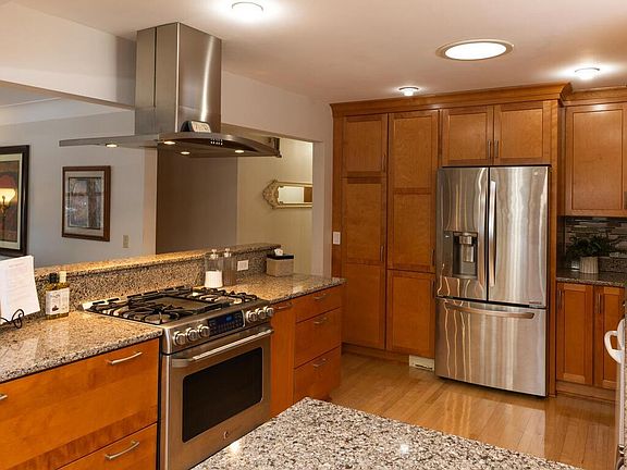 Wonderful mid century walk-up rambler offers an abundance of modern updates! Stunningly updated & expansive kitchen w/custom cabinets, self-closing drawers, Cambria countertops, tile backsplash, ss duel fuel range w/vented hood! Bright, open floor plan w/spacious dining area + eat-in kitchen area walks out to huge deck & backyard w/mature trees perfect for entertaining. Bright, open floor plan welcomes sunlight + 2 added solar tubes for added light! Beautiful maple hardwood floors in kitchen, DR, hallway + oak floors in 3 brms! Two cozy, brick gas fireplaces! Owner's bath w/marble floor, custom tiled walk-in shower. Second updated bath on ML w/marble floors, travertine tile, whirlpool tub! Lower level has spacious Family Room w/laminate flooring, display cabinets & wine rack, 2 huge storage closets! Shed, 2 1/2+ car garage w/work bench & loads of storage cabinets. Newer HVAC, roof, siding, windows, deck! Close to downtown, West End, parks & more!