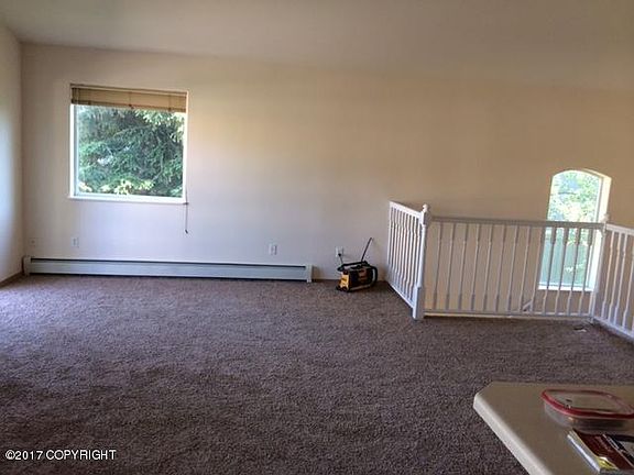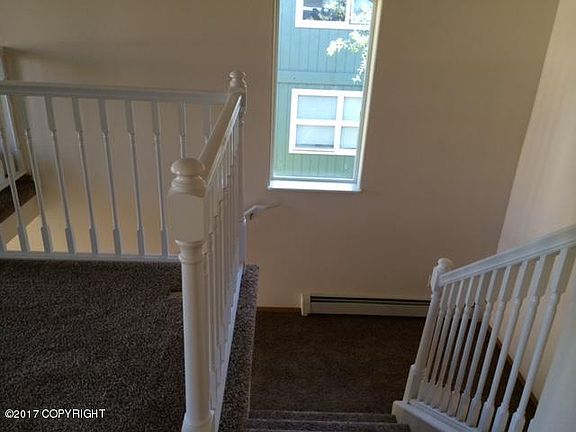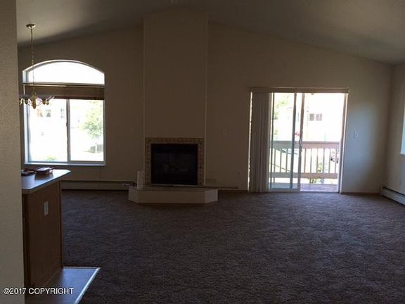 Turnagain! Great neighborhood close to schools,trails,airport townhouse style duplex. Large open concept kitchen dining living with fireplace and vaulted ceilings and small balcony off living. Two bedrooms one bath up and one bedroom, bath and extra living area downstairs with deck and sliding door to fenced back yard and convenient washer dryer at bottom of stairs coming in from two car garage.