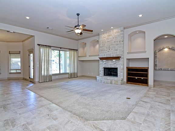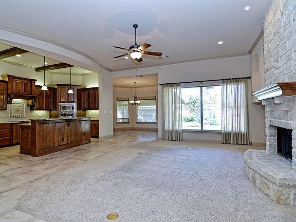 Charming one story home on a very flat lot. Swing in drive way leads to 3-car garage. Wonderfully open floor plan features large rooms - dining room has built-in buffet which separates the space from the living area. The kitchen has beautiful custom cabinets, under and over cabinet lighting and great counter space. Spacious study with wood flooring, plantation shutters, and stone fire place in living area. Breakfast room has bayed out window opens to stone covered patio backyard.
