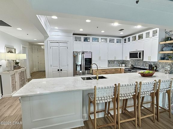 Turnkey 3BR Condo in Harbour Village - Sunset Views! Rare opportunity to own a beautifully renovated 3-bedroom, 3-bath condo in highly sought-after Harbour Village in historic St. Andrews. Walk to restaurants, shops, and parks from this prime location in the West Building, offering stunning west-facing sunset views. The open-concept floor plan features a fully updated kitchen with custom cabinetry, quartzite countertops, mosaic backsplash, new LG appliances, and gold fixtures. The spacious living area includes custom shelving and a new electric fireplace. Enjoy all-new LVP flooring, updated lighting, and hardware throughout. The luxurious primary suite boasts a fully renovated bath with large tiled shower, new vanities, custom closets, and designer finishes. Both secondary baths have been upgraded with new vanities and countertops. Relax on the private balcony with a summer kitchen, gas grill, beverage fridge, and sun shade. All renovations completed recently — truly move-in ready! Don't miss this rare find in Harbour Village! Boat Slip and Storage also available. All measurements are approx. and should be verified.