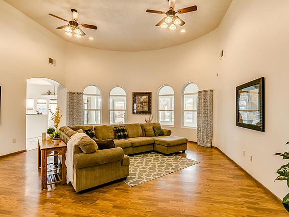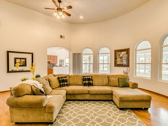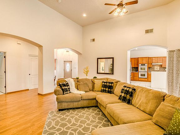 Ron Montoya Custom Designs home built by Cherished Custom Homes. Open floorpan w/ lots of natural light. Large great room w/ raised ceiling offers versatility in use of space. Eat-in kitchen has granite counter tops w/ decorative tile back splash, 42'' cabinets, stainless steel appliances, double Jenn-air ovens, gas cook top, pantry, breakfast bar. Master suite includes tray ceiling, door to sunroom, jetted tub, separate shower, double sinks, walk-in closets. Two additional spacious bedrooms w/ Jack & Jill bathroom. Office/study could be 4th bedroom. Sunroom provides an extra living area. Refrigerated air, laminate wood and tile flooring, travertine bath counter tops, stacked stone exterior accents, SW gravel landscaping, backyard access, half acre lot.
