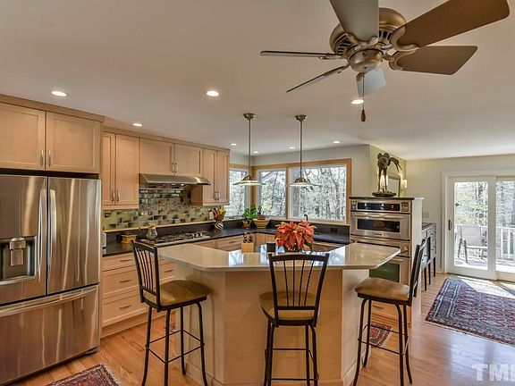 Updated and well-cared for contemporary home on 2+ acres in the Chapel Hill / Carrboro City Schools. Geothermal HVAC and sealed crawl space for peace of mind. Gorgeous cooks' kitchen done by Frank Cole with attention to detail and treetop views. Public spaces transition easily from calm evenings to lively gatherings. The expansive decks and hot tub feel like a mountain retreat every day. Main level owner suite option w/ updated bathroom. Second floor has an airy office with great light and storage galore.