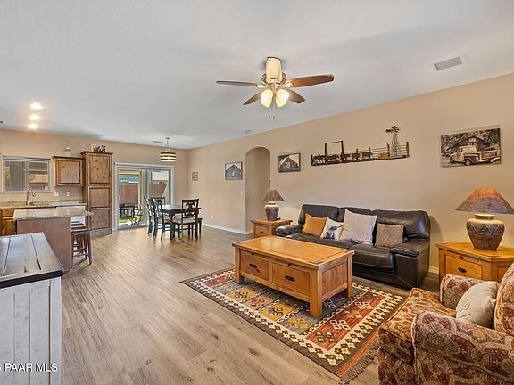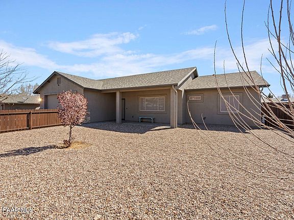 Beautiful 2020 home in central Prescott Valley with no HOA! PAID OFF SOLAR for this 1445 sqft single level open and split floor plan featuring 3 bedrooms, 2 bathrooms, and 2 car garage sitting on .22 of an acre. The kitchen boasts designer features throughout showcasing a large island, granite countertops, beautiful custom cabinets, and stainless steel appliances. Enjoy a spacious dining room and living area. The master suite offers plenty of room with a generous walk-in closet and a master bath featuring dual vanities and granite counters. Privacy fencing in back yard, 3 car paved driveway and RV parking spot, landscaped in front and back yard. Sun shade on back patio and new security screen on front door. Minutes to shopping, schools and medical. Make your appointment to see it today!