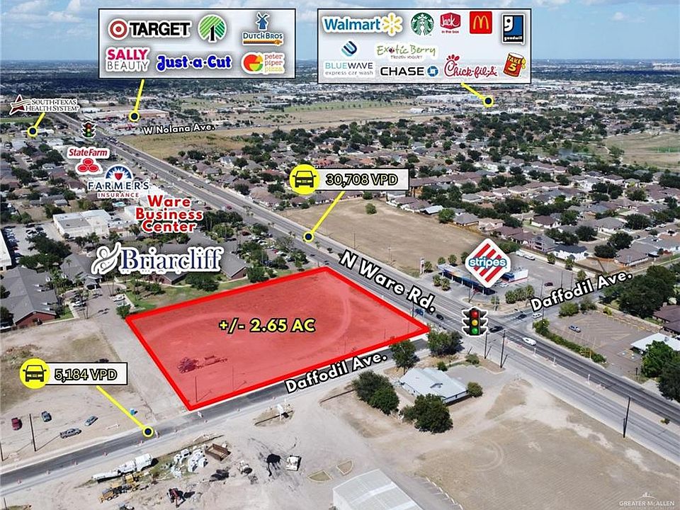 This excellent development site sits at the corner of Ware Road and Daffodil Ave. This site sees a combined total of 35, 892 vehicles per day in traffic and just South of the Nolana/Ware intersection. With superb traffic counts, a large footprint, proximity to heavy retail and upcoming development, this site is ideal for any developer.