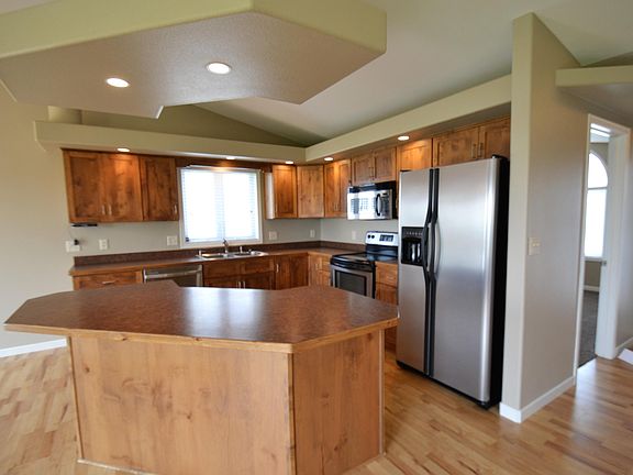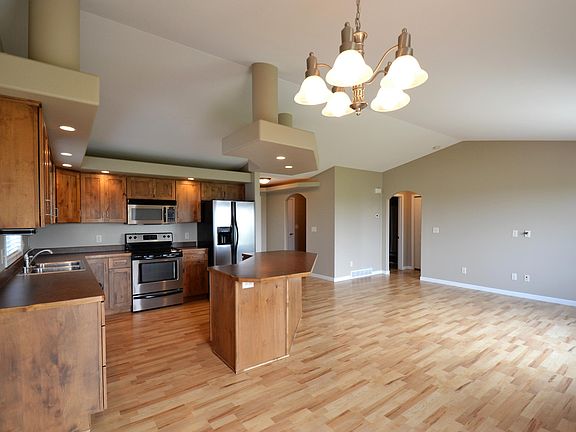 So much more than what meets the eye from the curb! This property is a rare-find beautiful Ranch Style home with Triple Garage and wide open backyard views located in the city on a quiet, non-through street. The home has an open floor plan with many desirable extra features including beautiful knotty alder soft close cabinets, stainless appliances, arched doorways, vaulted ceilings with lighted soffit accents, white baseboards and three-panel doors. Enjoy entertaining in the large family/theater room with surround sound system. Custom window coverings throughout the home. Patio door leads to gorgeous large backyard with a deck and concrete patio, lawn sprinkler system and irrigated raised garden with smart controls. Garage is finished, heated, has stained floor, floor drain and splash guard FRP paneling to protect bottom 3' of walls. Move in ready and close to elementary school. Call for a showing today!