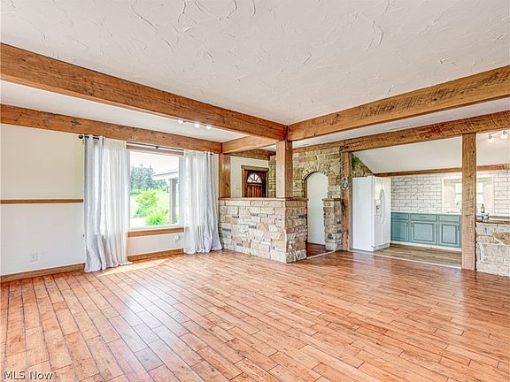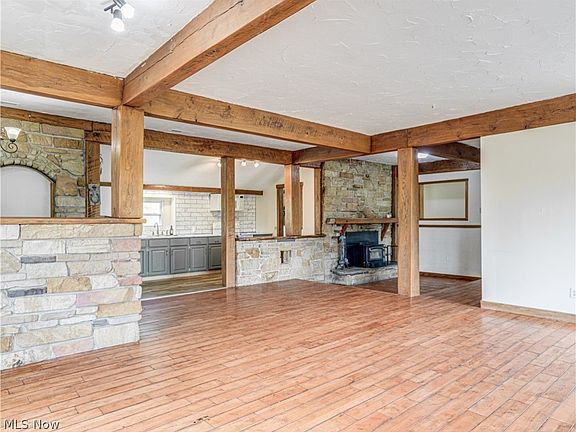 Inside, the house boasts an open floor plan with exposed wood beams and a cozy wood-burning insert, creating a warm and inviting atmosphere. A brand-new metal roof, installed this year, ensures durability and modern appeal.