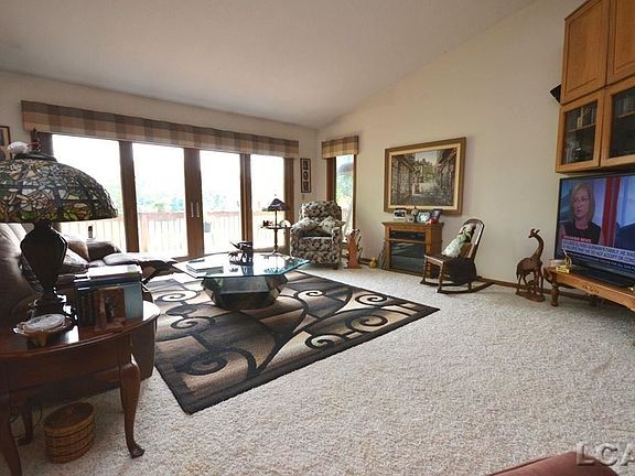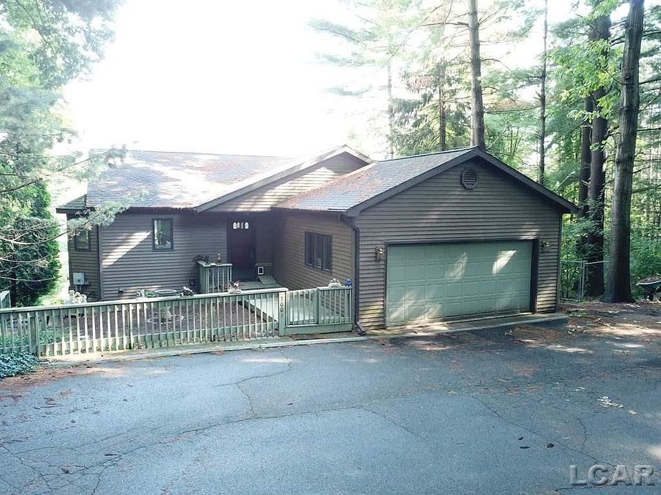 400 Ft. of Frontage on Lake Adrian situated on 4.63 wooded acres! This 4 bedroom, 2.5 bath ranch home features vaulted ceilings, eat-in kitchen with plenty of counter space & cabinets plus built-in desk area. The formal dining room, living room, master bedroom & screened-in porch have access to upper deck. Full finished walk-out lower level offers recreation room, 3 bedrooms, full bath, laundry/utility room and access to lower deck. Attached 2 car garage plus 2 additional garages. Scenic views from both the upper and lower lakeside decks with extensive stairs leading to walking paths and lake. Covered picnic area with built-in BBQ pit close to lakeside for your entertainment and family gatherings. Newer microwave/fan, water heater, disposal and sewer system. Includes lifetime dry basement warranty.