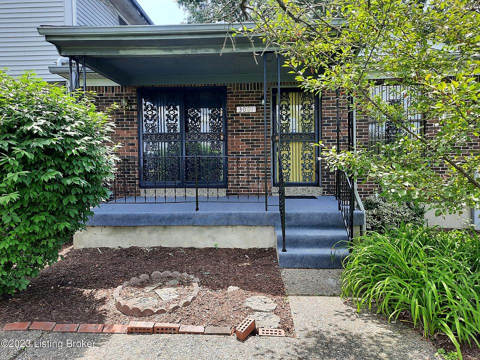Large covered front porch with new outdoor carpet with double glass patio doors lead to the dining room.