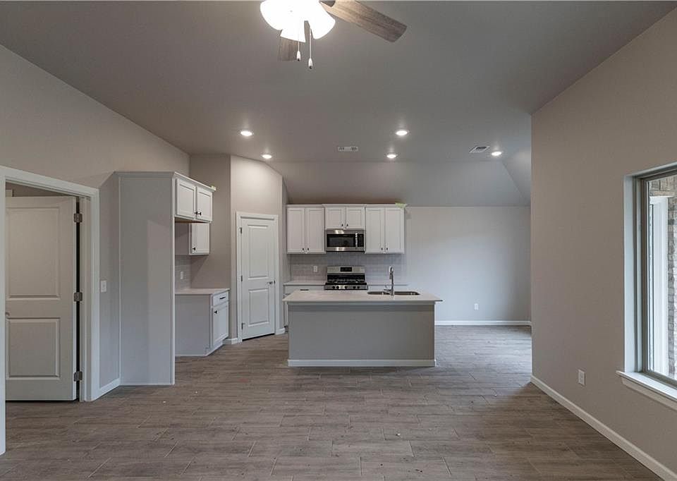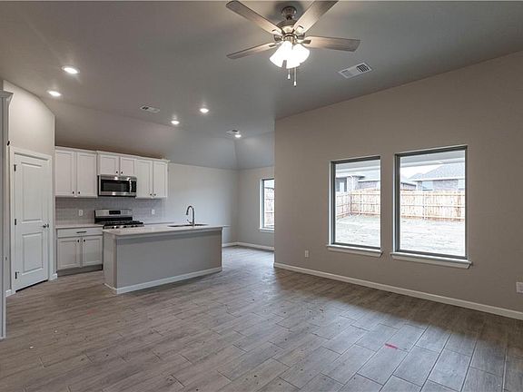 This Bogan Floor Plan includes 1,510 Sqft of total living space, which includes 1,400 Sqft of indoor living space & 110 Sqft of outdoor living space. There is also a 395 Sqft, two car garage w/ a storm shelter installed. Home offers 3 beds, 2 baths, 2 covered patios, an office, & a utility room. Living room welcomes wood-look tile, large windows, a ceiling fan, & wires for your TV. Kitchen has granite or quartz countertops, Frigidaire stainless-steel appliances, wood-look tile, well-crafted cabinets w/ decorative hardware, & stylish tile backsplash. Primary suite is straight ahead & features carpet flooring, a ceiling fan, & perfect-sized windows. Primary bath offers a dual sink vanity w/ elegant countertops & backsplash, a walk-in shower, an elongated water saving toilet, & a HUGE walk-in closet! Outdoor living is covered & has full sodded yards w/ a water saving sprinkler system. Other amenities include a tankless water heater, a fresh air intake ventilation system, & so much more!