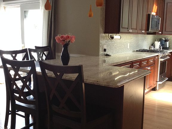 this two story colonial house has a newly remodeled kitchen with open floor plan, new bathrooms with custom tile work, bedrooms have new carpeting with large rooms, master bedroom with a walk in closet. big yard with white vinyl fence and invisible fence, irrigation system, two decks, natural gas grill and outside shower.