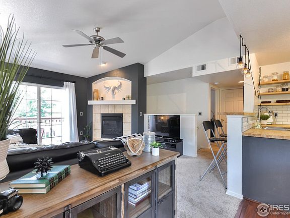Beautiful loft style condo in west Fort Collins. This home has been lovingly maintained and includes remodeled kitchen w/butcher block countertops, updated lighting, some open shelving and vinyl wood flooring. Vaulted ceilings, gas fireplace, a deck and mountain views complete the main living space. Master bedroom with vaulted ceilings and walk-in closet. New updated vanity and flooring in bathroom.