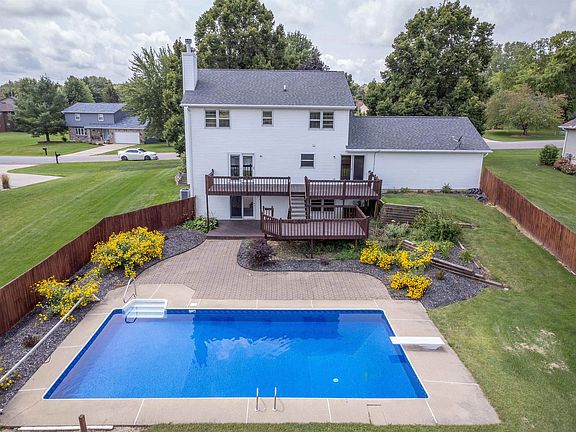 Situated on over 3/4 of an acre, this property offers a remarkably private setting. The classic 2-story layout features a spacious fenced backyard, an inviting inground pool, and multi-tiered decks perfect for all. The main floor boasts a formal dining room, a front living room currently serving as an office, a kitchen with dining area and access to the deck, as well as a cozy living room with a fireplace and deck access. Upstairs, you'll find 4 bedrooms and 2 full baths, with the master bedroom featuring double closets and an updated full bathroom. The lower level, with walkout and daylight, presents a game area, a family room with patio access, a bar, and another full bath. Additionally, a generous 24' x 24' garage and a 14' x 20' shed offer ample storage space. The back of the property hosts a bountiful garden with apple trees, asparagus, raspberries, and more. Recent updates include a chimney liner and fireplace insert in 2022, a new pool heater in 2022, a roof replacement in 2017, a new furnace and central air system in 2016, a water heater in 2016, a remodeled master bathroom in 2023, an updated full bath in the lower level in 2021, new flooring upstairs in 2022, fresh living room carpet in 2021, a new pool liner in 2022, a pool pump in 2023, a brand-new pool solar cover, a pool robot cleaner, and redesigned landscaping in 2023. Don't miss out on this well maintained home. Some of the furniture may be virtually staged, no alterations or changes to the home!