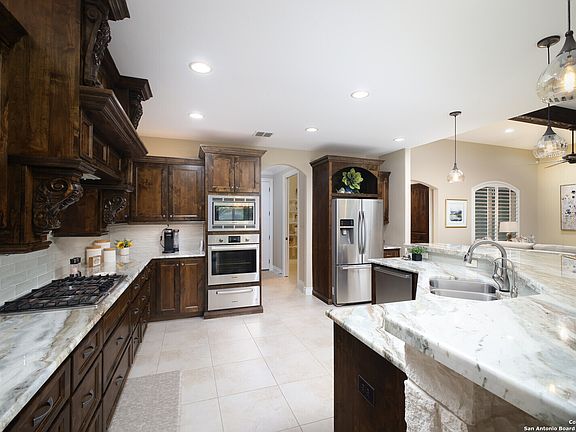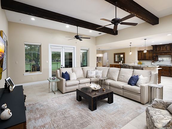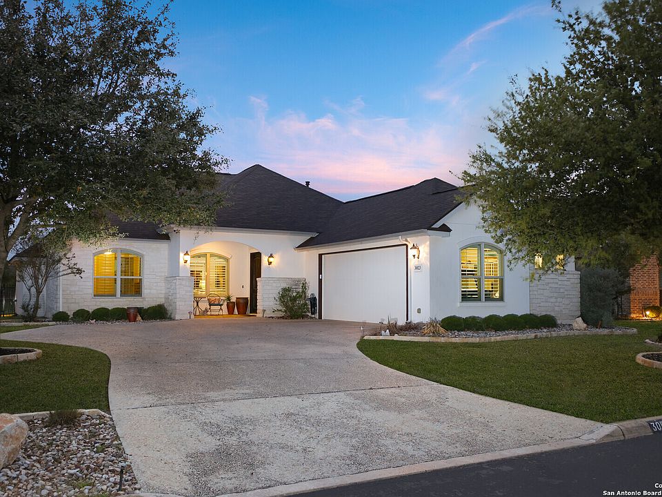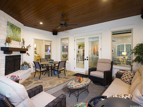 Gorgeous one-story with 3 beds/ 2 baths, 2318 sqft home in Fair Oaks Ranch neighborhood! The home welcomes you to a cozy living room with high ceilings, an open floor plan, natural light from the large airy windows, and overlooking a beautiful flagstone patio with a wood ceiling and stone fireplace leading to a gated/fenced yard with a green belt view. The open kitchen has custom cabinets, granite counters, Stainless steel appliances, a gas cooktop, and an oversized pantry. The primary bedroom has a large walk-in closet, a full bath with an oversized shower, and a separate vanity. Great backyard space and relaxing covered patio perfect for gatherings! Boerne ISD. Welcome Home!