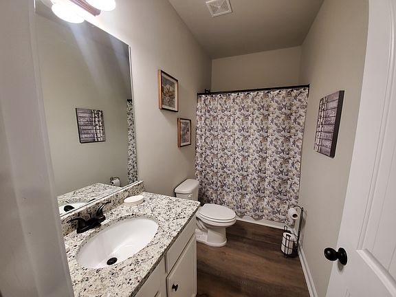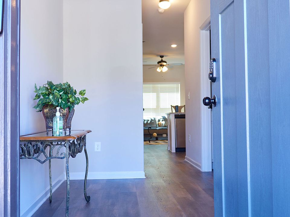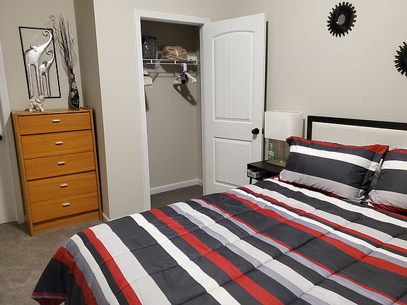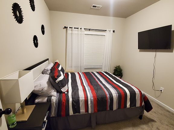 Privae bedroom with full bathroom. Located on the first floor of a 3-Bedroom, 3-Bathroom Townhouse. The room is fully furnished with a Queen bed, chest of drawers, underbed storage, nightstand, lamp, chair, wall-mounted Roku TV, and standard closet. Rental includes a Bed-in-Bag, extra sheet set, 2 standard pillows, 2 towel sets, bathroom rugs, shower curtain and liner, curtains and blinds, hangers, wall and dresser decor. The room is fully carpeted Shared Space You will share the kitchen, dining, and living area. Also shared are the laundry facilites and office area (both on 2nd Floor), hallways, utility closet, pantry, and patio. All areas are furnished and decorated. Shared areas are fully furnished and include kitchen set up (pots, pans, dishes, utensils), refrigerator, microwave, toaster, electric range, dishwasher, garbage disposal, 2 counter height stools, 4 seat dining room table, sofa, chair, end tables, lamps, desk, chair, TV stand, Roku TV, coffee table, room and wall decor. The Townhouse has WiFI access, and a monitored security system (including window sensors, indoor motion detector, doorbell camera, and outdoor motion detector spotlight with a camera). There is free off-street parking, and public transportation is just steps away. You may access community areas and facilities, including the pool. You will share the townhouse with 2 other tenants, both male, and a large service dog (no pets are allowed). *No smoking allowed. *No pets allowed (however, currently, there is a service dog on premises, with access to common areas). *Current tenants are Male. *The utilities Fee is based on household usage and is split among the current leased tenants. Fees have typically averaged about $60 per person. *Tenant must adhere to HOA rules and regulations. *Guests shall not stay on the premises more than 3 consecutive days. *Images are representative of the furnishings, because furnishings change from time to time.