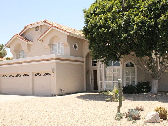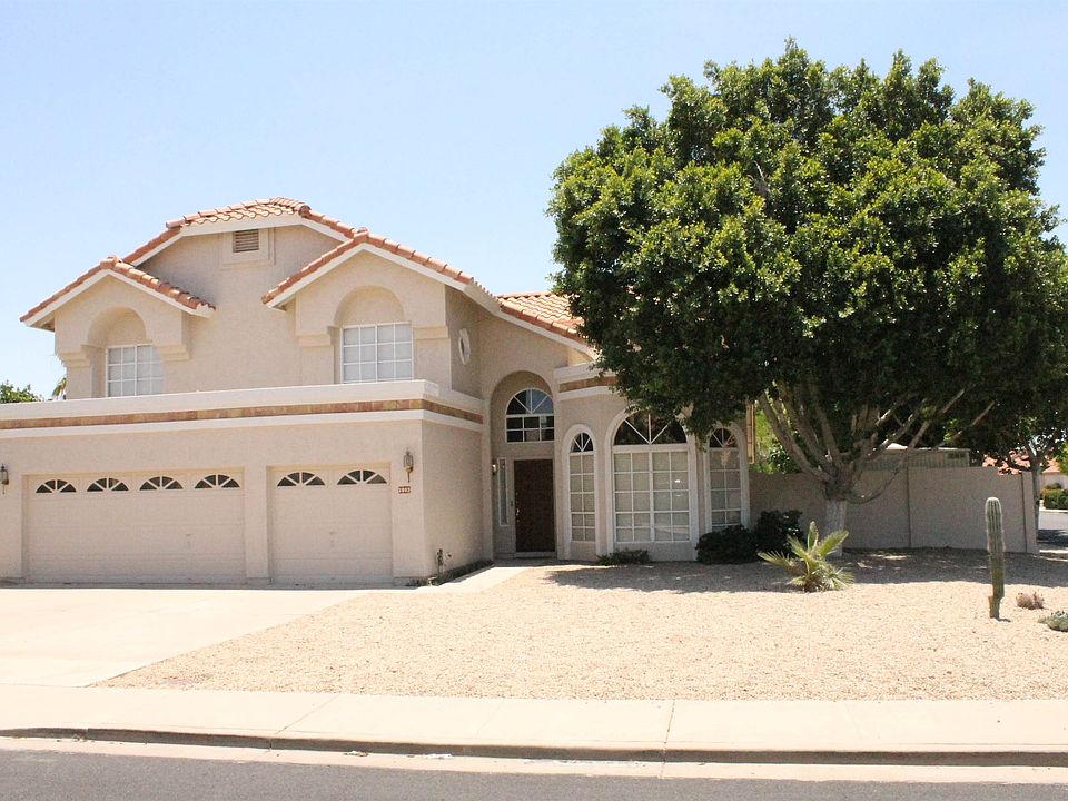 New AC unit put in the last week and recently painted exterior gives the home a fresh look and great curb appeal with appealing neutral colors. Great opportunity to own a home with award-winning schools in a great location and easy access to the 202. Priced below recent comps, this home provides the opportunity to personalize with your own touches. Separate living and family rooms with vaulted ceilings make this home one of the most popular floor plans in the neighborhood. Extra large Master suite on the first floor with 3 closets make it a great place to escape. The backyard features a diving pool, a therapeutic hot tub, a gazebo with lighting and fan, and citrus trees. It also features a large storage shed in a closed-off utility area. Don't miss the garage with extra power that makes it a great workshop.