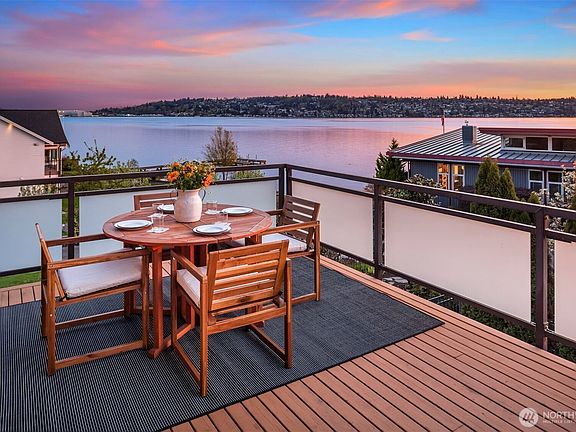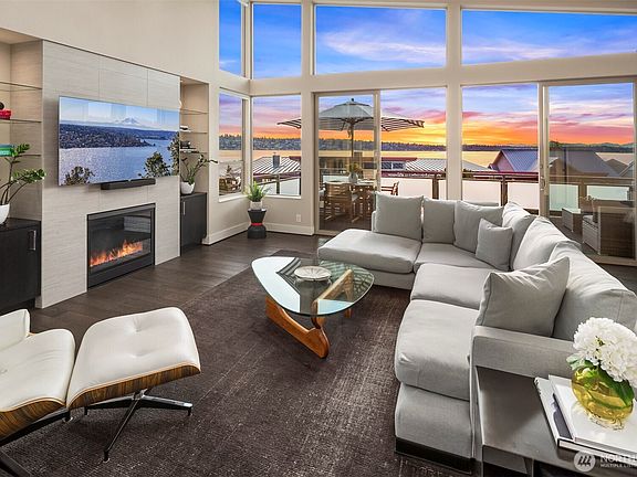 Breathtaking panoramic views of Lake Washington and the Olympic Mountains welcome you to this stunning contemporary home. The main level features soaring 14-ft ceilings, a wall of windows, and open living flowing to a chef’s kitchen and expansive deck—perfect for entertaining or quiet mornings. The primary suite has a spa-like bath and private mini-split; two additional en-suite bedrooms ensure guest comfort. Smart-Home features, water filtration, A/C, surround sound, hot tub, fenced yard, pre-built elevator shaft, and 2-car garage add convenience. Near trails, bike paths, and beaches for an exceptional lifestyle.