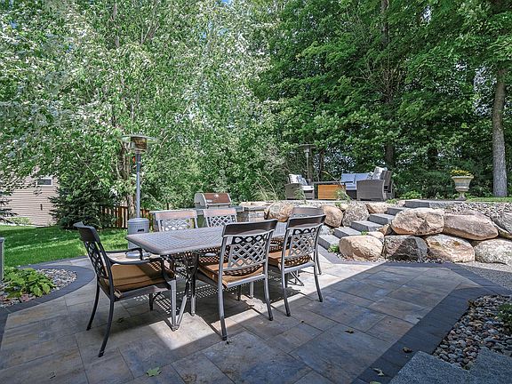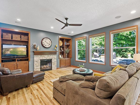 Welcome Home to this impeccably maintained 5 Bedroom, 4 Bathroom Two Story in the high demand Hurst Woods Neighborhood. Located amongst a canopy of mature trees on a quiet cul-de-sac perched up on a hill from the Crow River. Better than new construction with over $100,000 in upgrades added in the past year including a 2 level custom stone patio, new sun room addition with vaulted ceilings, custom motorized window treatments and wood beams, all new hickory hardwood flooring on the whole main level, and new stone surround on fireplace. New furnace, a/c, washer/dryer, and dishwasher all in 2023. Upper level includes 4 spacious bedrooms, laundry room, and loft space. Lower Level has custom built-in cabinetry and fireplace, wet bar with built-in beverage fridge, 4th Bathroom with travertine tile, and 5th bedroom. Well thought out landscaping with irrigation system and low voltage landscape lighting makes for a backyard oasis. Just minutes from Lake Rebecca Park Reserve.