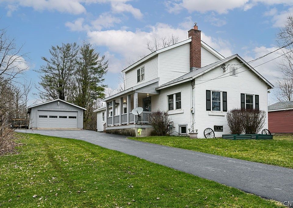 Exceptional 2-story home on large lot with loads of updates! Spacious entry leads to den/optional formal dining with hardwoods throughout. Two first floor bedrooms with additional flex room that may be easily customized as 1st floor laundry or office connecting to full bath. Kitchen w/ solid oak cabinets, new flooring, eat-in dining area & breakfast bar w/ seating, front living room w/ hardwoods & fireplace. Second floor boasts large bedroom w/ ample lit storage/closet space. Recent updates: House & garage roofs, flooring, driveway, painting, appliances & many more! Exterior includes side porch w/ new lighting fixtures & amazing views, flat partially fenced yard perfect for entertaining. Extra-large 2-car garage, freshly painted with new roof & overhead door/additional shop space. This home offers a rare opportunity with its prime location, in close proximity to NYS Thruway, area schools, restaurants & shopping!