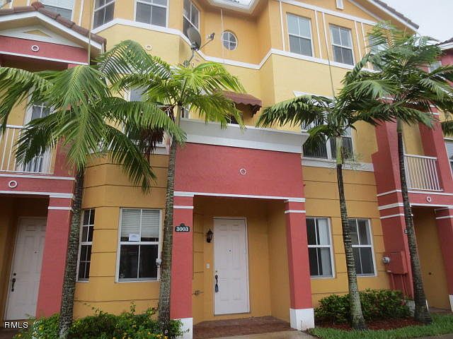 Pet friendly split bedroom floor plan spacious townhome in gated Shoma Homes development. One bedroom with a full bathroom is downstairs, kitchen with living room & a guest bathroom on the 2nd level & two master suits upstairs. Unit comes fully equipped with newer stainless steel appliances inc full size washer & dryer. One car garage. Right across community pool. Walking distance to Publix plaza, "A" rated schools, 2 miles to Wellington mall