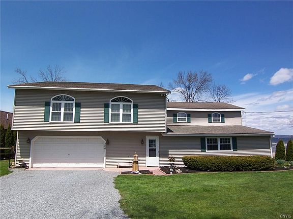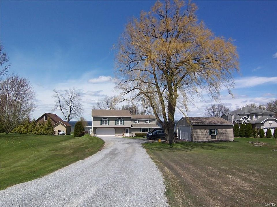 A home that is like being on vacation everyday! Stunning waterfront offering 2,628 +/- square feet! Extensively renovated. Great room with stone gas fireplace and soaring ceiling. "Bar room" with fireplace and door to rear deck. Kitchen with stainless appliances, formal dining with hardwood floor, one bedroom and bath on 1st floor. Upstairs has a huge family room with a ton of windows, 4 more bedrooms and another bath! 2 car attached garage with front and rear doors plus a detached 2 1/2 car garage with front and rear doors! An expansive yard of 1.03 acres, 51 feet of lake frontage! New natural gas boiler, 3 air conditioning/heat monitors, city water, city sewage, vinyl siding, thermopane windows, walk-out basement, deck, patio. Bring the family, the boat and your jet skis! NO flood insurance here!
