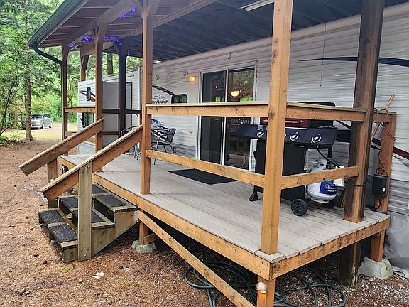 MUST SEE immaculate 2007 40' Jayco Park Trailer on large, QUIET Div. 3 lot. The primary bedroom feels like a private retreat with a wall of windows that bring the outdoors in, while the second bedroom sleeps two adults and even more children! Slide outs make this already large trailer feel like home, and the permanent roof structure covers the trailer and a large deck for entertaining outside. A fenced gazebo serves as a covered firepit and a dog run, with two wood sheds nearby to keep you well stocked. The maintenance shed in back has many items and tools to help clean and maintain the property. Plenty of parking, and close to clubhouse, indoor pool, and all amenities. Come see why this lot puts the 'Paradise' in Campers Paradise!
