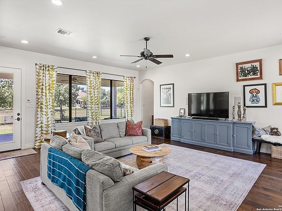 One of a kind custom French Modern style home built by Atkinson Custom Homes in Fair Oaks Ranch greets you with beautiful hardwood floors and sweeping views of the backyard. The open-concept living space, highlighted by an accent beam, flows effortlessly into the dining area and chef's kitchen, featuring flamed granite countertops, a commercial-style range with a gas cooktop, corbel detailing, and travertine accents. Enjoy the media room (currently a gym) with 3D projection, surround sound, and Smart Home Audio. The primary suite offers private patio access and a spa-like bath. Both the utility room and primary closet are plumbed for laundry. Upstairs, you'll find spacious bedrooms with en suite bathrooms and a central game room. Outside, the covered patio features a gas line for grilling and raised electrical outlets for a mounted TV, and opens to a greenbelt with privacy landscaping and an iron fence. Close to the Fair Oaks Ranch Country Club, Exemplary Boerne ISD, LOW Comal County taxes, weekly lawn service included in HOA. Home Sweet Home!