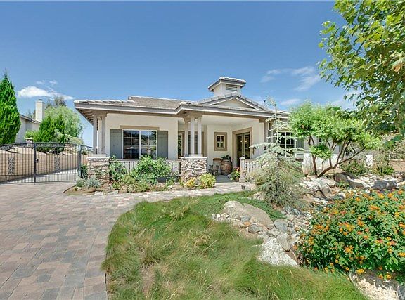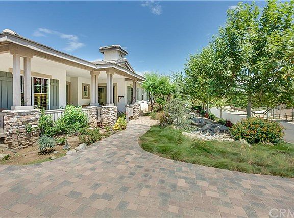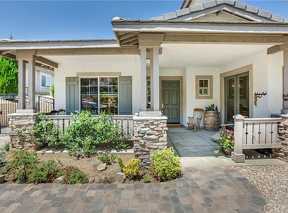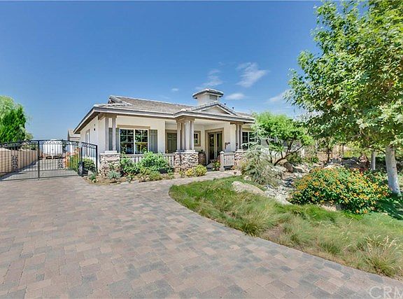 NO MELLO ROOS!!! Wild Horse Estates Norco Hills Single Story Home, offering 2480 sq ft, 4 bedrooms, 2.5 bathrooms, Ranch Style with a cozy front porch, deluxe travertine flooring, tall ceilings with crown molding, formal living room, formal dining room right off the kitchen, family room with a custom stacked stone fireplace, brand mantel and a full width hearth, custom upgraded media niche with lighting, kitchen with island, inside laundry room, long gated driveway, 3 car detached garage, RV parking, beautiful pavers for walkway and driveway, city lights views 23,000+ sq ft lot, equestrian zoned. Large community riding arenas across street and miles of trails right out your gate. Office/bedroom has a separate french door entry. Low maintenance front yard landscaping.