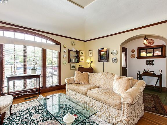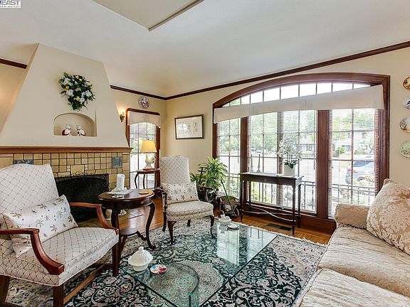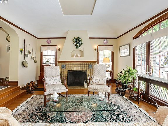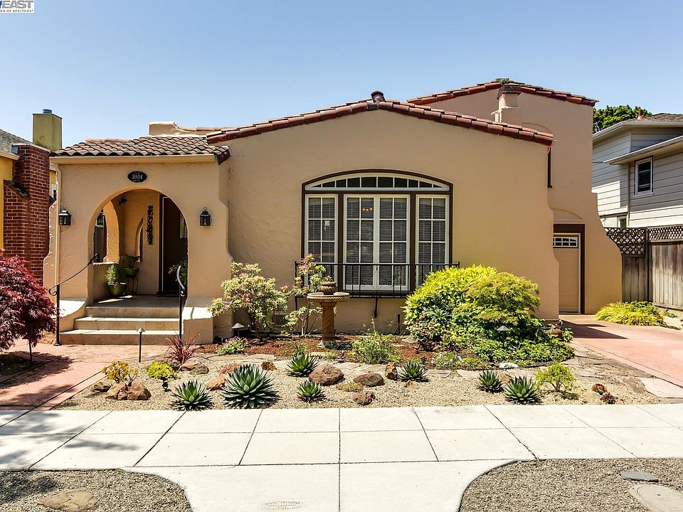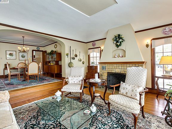 A 1928 beauty is located in one of Alameda's most coveted neighborhoods in the heart of the Fernside district, this Spanish Mediterranean-style home comes with all the original vintage details. The fireplace in the living room displays forest scenes of Yosemite back in the 20's. Genuine oak wood inlaid floors, cove ceilings, moldings and baseboards display the artistic gum-wood treatment that are in excellent condition. Formal dining room with french doors leading to a sunny deck. Spacious family room addition with 2nd fireplace. French doors that open to a beautiful park setting backyard with mature landscaping and walkways. Easy access to great schools.