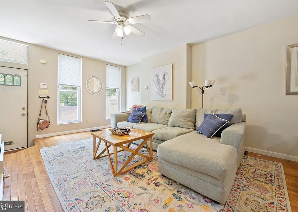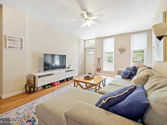 This three bedroom townhome has one full bathroom and one half bathroom with parking and a large basement for storage. Walk in through the front door into the living room where natural hues of hardwood and light gray walls with white trim set the tone for cozy ambiance. Beyond the living room there is a half bathroom, dining area, kitchen, laundry/mud room, and walk out to patio and the easily accessible parking space on the main level. The kitchen flows right off of the dining area giving a great open floor plan for entertaining guests. The basement is large and easily accessible by a stair case giving the owner the option to easily store items in a nice partially finished dry space. The parking off of the back fenced in patio is very wide open as it flows right off of a side street for easy access. The third level has two large bedrooms and one medium sized room all joined by a hallway full bathroom with shower and tub. This home is located in a prime location in the heart of Hampden across from Wyman Park. This home is located close to the I-83 exit, walking distance to the Avenue and Rotunda and is a short distance from John Hopkins university making travel to the campus easy.