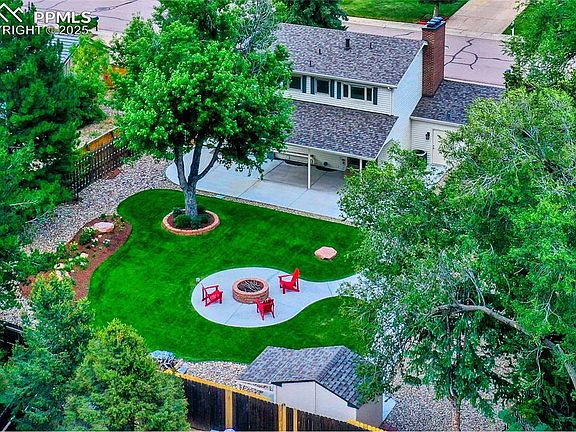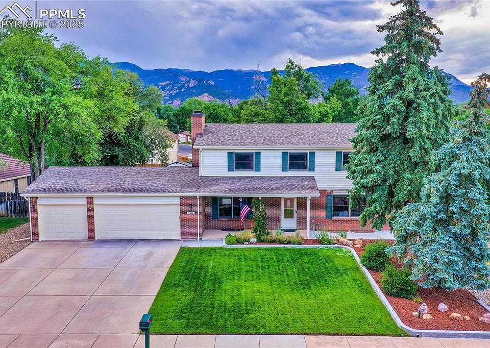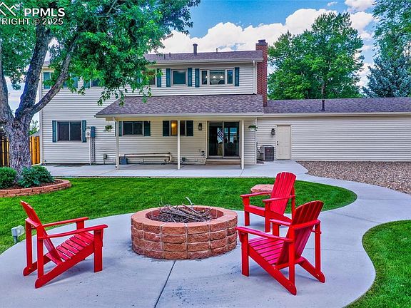 This stunning multi-generational two-story home in the sought-after Spring Lake neighborhood boasts views of Cheyenne Mountain. It has undergone a complete remodel, from the interior to the park-like landscaped grounds in the front & back, including a wood-burning brick fire pit in the backyard. Nestled on a quiet street in the Award-Winning District 12 school district. The main level features new luxury vinyl flooring, light fixtures, ceiling fans, and a gourmet kitchen with waterfall concrete countertops and all-new stainless appliances—a chef's dream. A breakfast bar adjoins the dining area, leading to a spacious living room at the entrance. The family room or Formal dining area, w/ its brick-surround wood-burning fireplace & sliding door, opens to a large covered concrete patio and a beautiful yard. Conveniently located between the family room & kitchen are the laundry & a half bath. The upstairs master retreat w/ fireplace offers a new luxurious bathroom w/ a double-headed spa shower, concrete countertops, dual sinks, & barn doors. Next to the master suite is a dressing room & walk-in closet. 2 more bedrooms & a full bath complete this level. The lower level features a new kitchen, wood-burning fireplace, second family room, laundry room, bedroom, home office & a new bathroom. Features include a new roof, exterior shutters, new lighting throughout, RV parking, storage shed with electric and water, radon system, Anderson and Champion windows, new carpet, three wood-burning fireplaces, fresh interior paint, electrical upgrades, new window screens, gutters, AC, fireplace mantels, recessed lighting and 20-amp electricity in the basement bedroom—perfect for hobbies. Located within walking distance to Broadmoor Elementary and biking distance to restaurants and the Country Club. Close by is the 5 Star Broadmoor Hotel! This serene retreat is waiting for you!