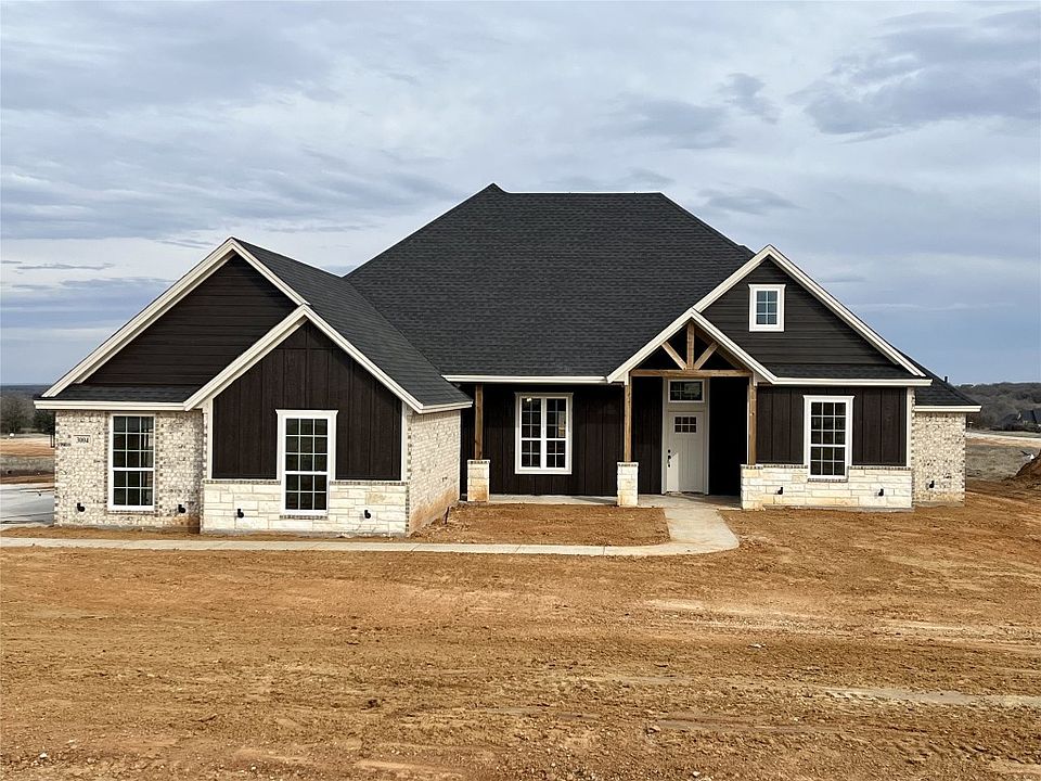 New construction! This charming, 4 bedroom, 2 bathroom, open concept home is located in beautiful Parker County. Stand out features of the kitchen will excite the cook in the family: window over the kitchen sink, custom built cabinets, island with seating, walk-in pantry, and stainless-steel range, microwave, and dishwasher. The owner's retreat includes roomy walk-in closet, custom built cabinets with separate vanities, walk-in shower, and separate garden tub. Tile floors throughout main areas and carpet in the bedrooms. Entertain, watch the big game, or sit and relax on the back patio by the wood burning fireplace. This cheerful home is ideal for hosting get-togethers with friends and family, working from home, or simply enjoying the sights and sounds of country living. You'll be delighted to call this place your home.