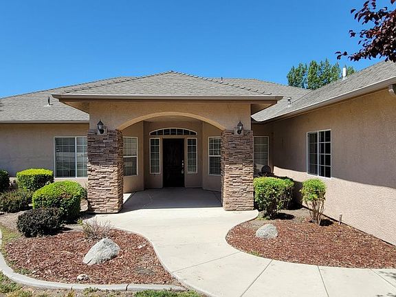 Comfortable sophistication! The covered front porch invites you into this lovely home. Such a nice floor plan and light filled rooms with great views of our valley. The split wing primary suite allows privacy and covered back patio access! Relax in the jetted tub or spacious stall shower. Storage galore is inside the walk-in closet. The great room has extra tall ceilings and a stacked stone fireplace. Enjoy the view out to Bear mountain with back yard access too. The 4th bedroom has french doors and is also perfect as an office with gigabit fiber optic internet. 2 additional large bedrooms and a full bathroom are beyond the kitchen and breakfast room. Your kitchen has so much storage and prep area and includes knotty pine cabinets and lovely granite countertops. Plenty of space in the pantry too. The formal dining room can accommodate a large table. A wash basin is in the laundry which leads to the 3-car garage with lots of options for storage. Step out from your great room to the covered patio and enjoy the low maintenance landscape. There is ample room to add a veggie or flower garden too! Just the right size house and lot! Check it out fast!