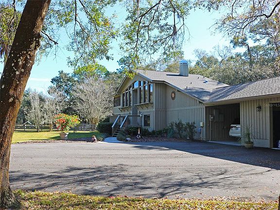 Spectacular "Old Florida" ambiance abounds in this 2.5 acre estate. Winding , tree lined drive leads to the magical storybook house nestled in the lush Florida landscape . You will feel like you are in a treehouse from the large great room with soaring ceilings , stone fireplace and magnificent floor to ceiling windows . Walk out into nature on 2 large balconies , one screened and one open . Elevator from ground floor to upper balcony . Updated kitchen with tranquil window view of magnificent Oaks. Walk in pantry . Four bedrooms and 2 bathrooms on the main level with easy access to the outside. Incredible, oversized garage with automatic doors on 2 sides plus a carport - plenty of room for toys and hobbies . Totally fenced with electric gate . Ideally located close to I75 .