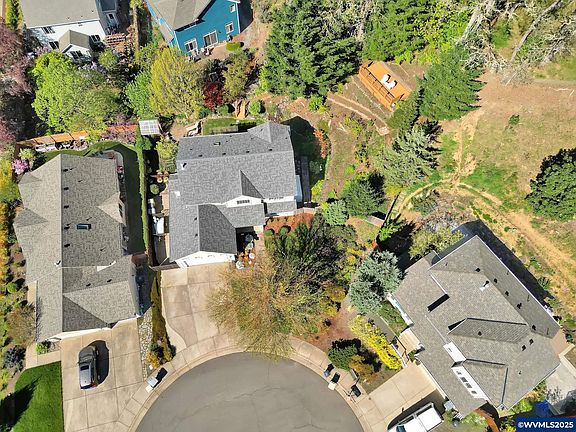 Excellent indoor-outdoor flow for both entertaining and everyday enjoyment in this residence on cul-de-sac in established neighborhood. Oak floors, quartz kitchen counters, gas fireplace. Main level with living and dining areas. Carpeted upstairs primary suite with ensuite bath, three additional bedrooms. Covered deck, hillside views of Mary’s Peak, fully fenced yard, greenhouse, and waterfall. New roof (2022), gas furnace, central A/C split system, RV parking, two-car garage, wine storage on lower level.