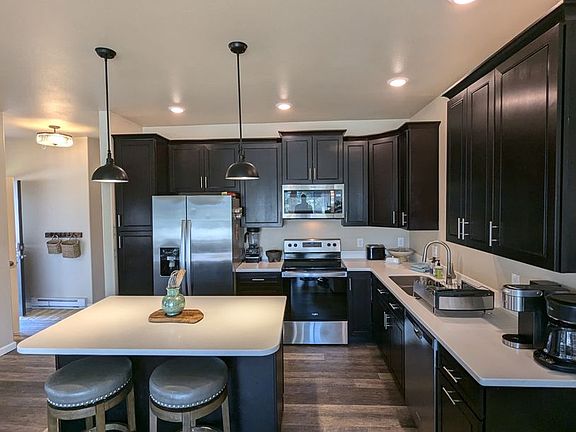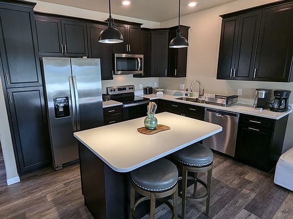 Beautiful 2BD/1.5BA, 1028 sq ft. Vintage Park Condo (2nd floor) Available 6/16/25. Laminate flooring throughout. Features a kitchen with island, stainless appliances, stacked laundry and a covered outside deck. 1 exterior assigned parking space. Rent includes W/S, garbage, snow removal, electric heat/hot water. Tenant will need to supply cable/internet. Convenient location with nearby shopping, airport, and a pod of food trucks just down the street. End unit. No pets, no smoking. Minimally furnished, video is from when unit was fully furnished. Long term lease to 6/30/26.