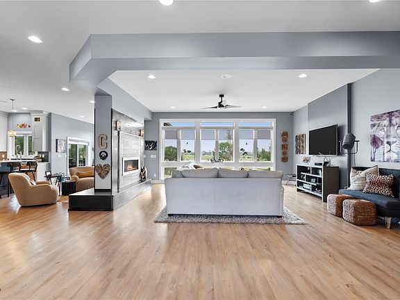 SALE PENDING - showing for back up offers through inspection period. Welcome to this exquisite luxury home, offering a breathtaking view of a serene pond with a dock, perfect for swimming or kayaking. As you enter, you'll immediately notice the attention to detail and the impeccable design throughout. The main floor features new luxury vinyl flooring and boasts expansive windows that showcase the stunning pond area. The heart of this home is centered around a two-way fireplace connecting the great room and the kitchen hearth area. This creates a cozy and inviting area, perfect for relaxing or entertaining. The kitchen is a chef's dream, equipped with high-end appliances, ample cabinet space, and a large eating area for gatherings.