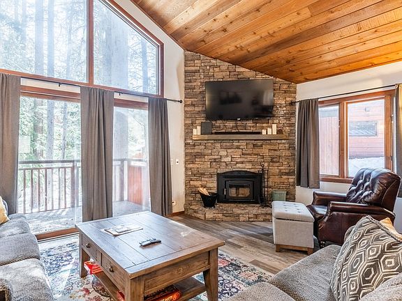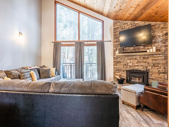 When you think of a "mountain cabin," this is what you think of—but it's better! This Mammoth condo has the charm of a cabin and the luxuries of home. You'll love that this home is turnkey, has the forced air heat, has a remodeled wood-burning fireplace, and has the feeling of being in the woods. The huge windows in the living room are south-facing, offering warm sun peaking through the pine trees. This is an amazing floor plan because you have two bedrooms and two bathrooms on the ground floor. In addition, there is a full bathroom upstairs. This comes in handy for any guests sleeping in the living room (you don't need to walk downstairs to go in the middle of the night). Recent upgrades include new floors, completely remodeled bathrooms, kitchen countertops, paint, added storage, kitchen sink, garbage disposal, many furnishings, and more. There is a convenient side shed with a new washer/dryer and tons of storage, even enough to store your bikes! Enjoy being only a half mile to Mammoth Mountain's Eagle Lodge and close to the free shuttle stop. In the summer, picnic in the green grass and stunning mountain views on the other end of this community. Don't let this quintessential Mammoth condo slip by!
